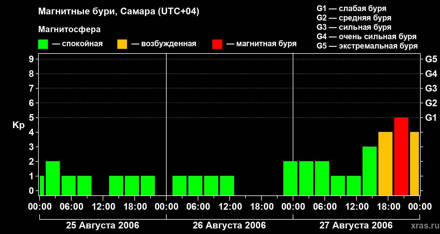 Изменения геомагнитного индекса Kp с 25 по 27 августа 2006 года для средних широт