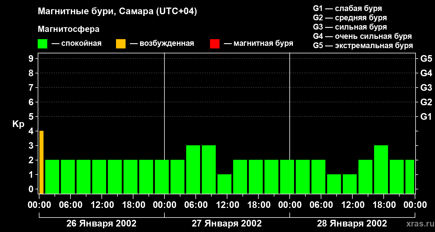 Изменения геомагнитного индекса Kp с 26 по 28 января 2002 года для средних широт
