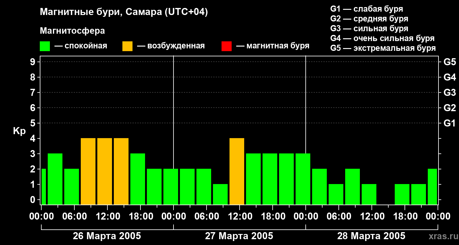 Изменения геомагнитного индекса Kp с 26 по 28 марта 2005 года для средних широт