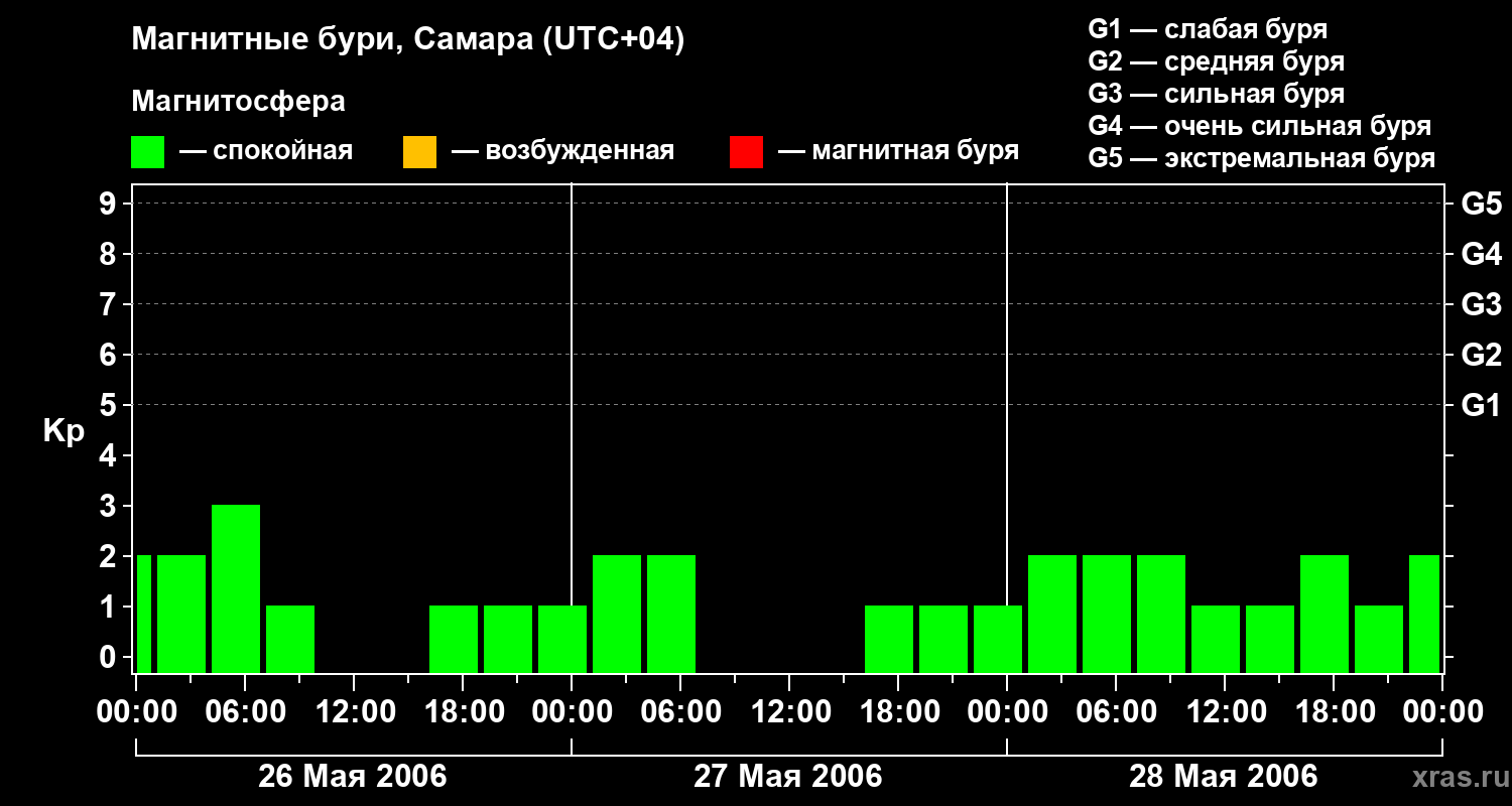 Изменения геомагнитного индекса Kp с 26 по 28 мая 2006 года для средних широт