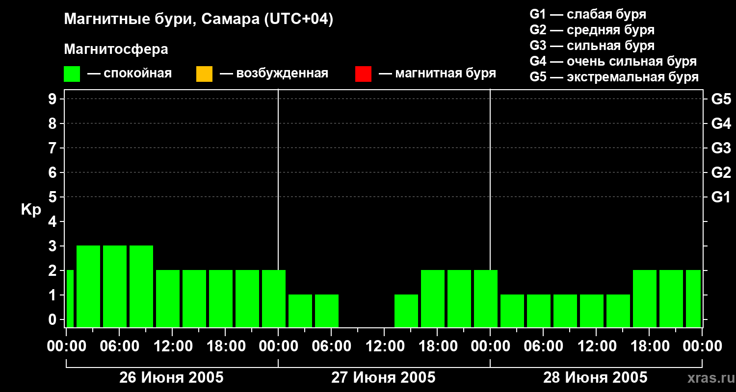 Изменения геомагнитного индекса Kp с 26 по 28 июня 2005 года для средних широт