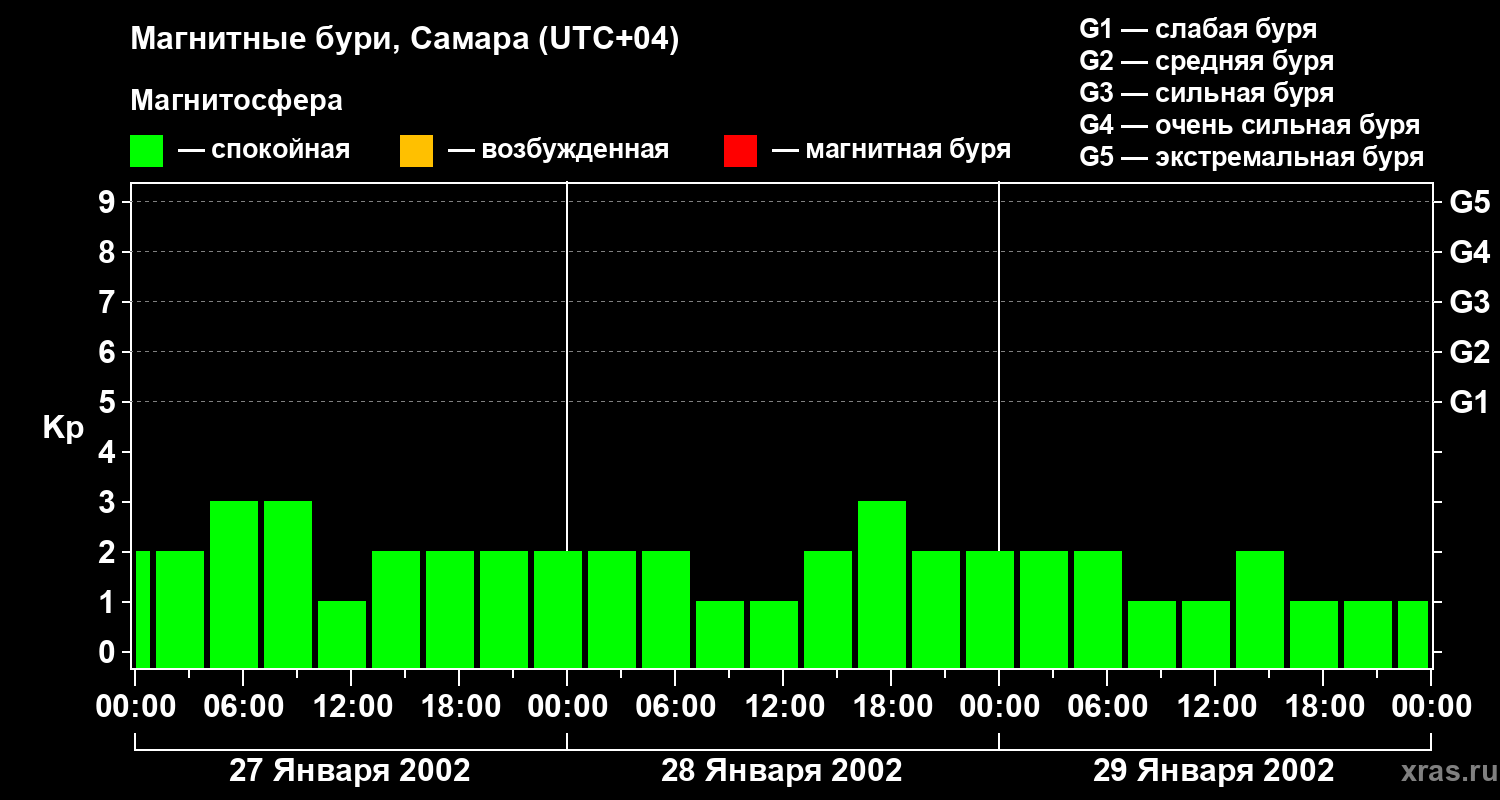 Изменения геомагнитного индекса Kp с 27 по 29 января 2002 года для средних широт