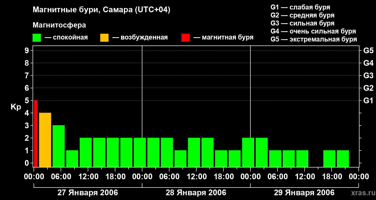 Изменения геомагнитного индекса Kp с 27 по 29 января 2006 года для средних широт