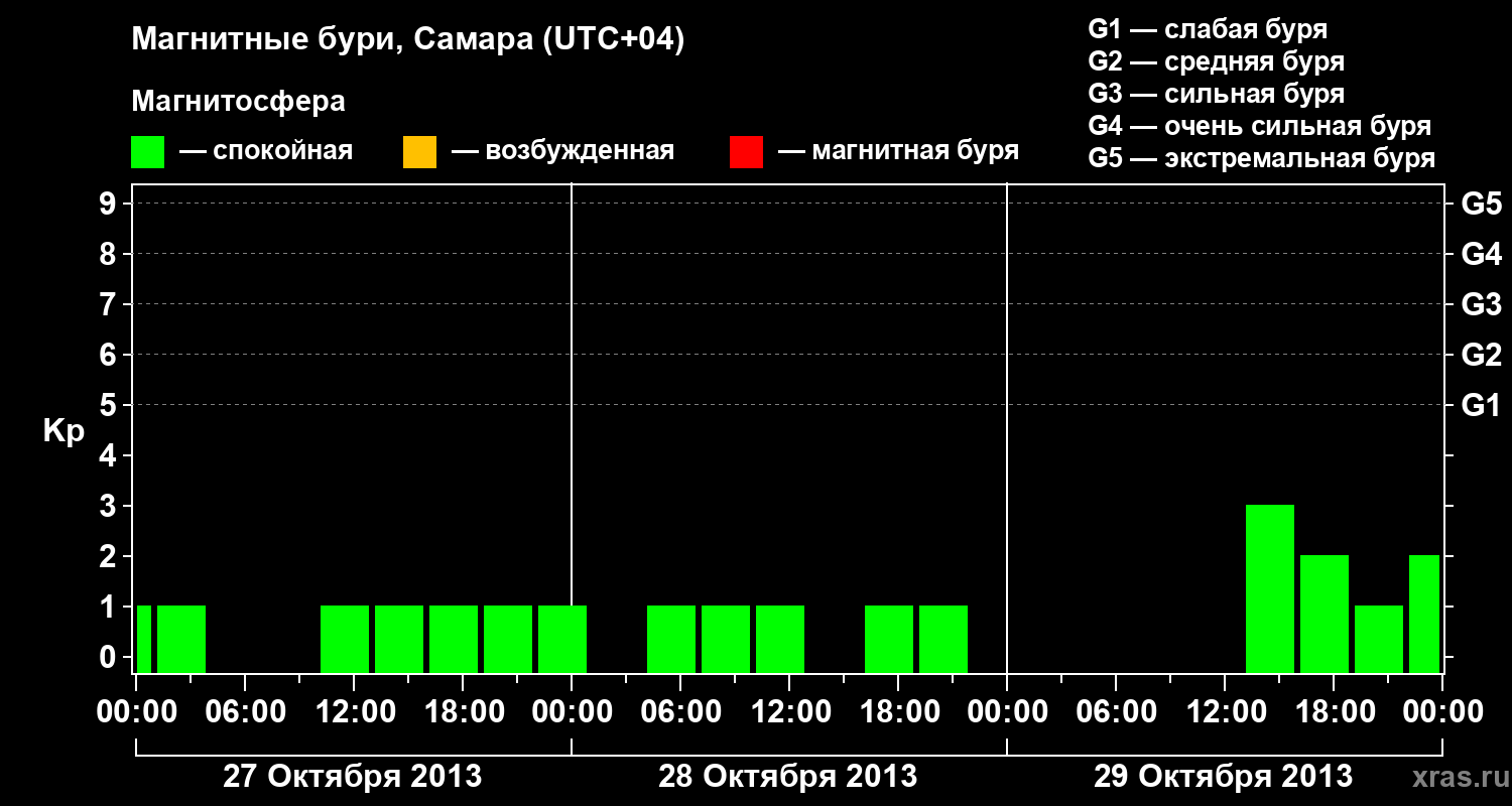 Изменения геомагнитного индекса Kp с 27 по 29 октября 2013 года для средних широт