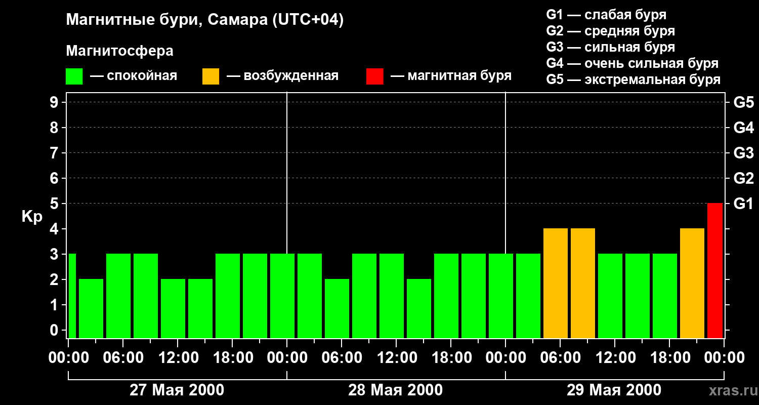 Изменения геомагнитного индекса Kp с 27 по 29 мая 2000 года для средних широт
