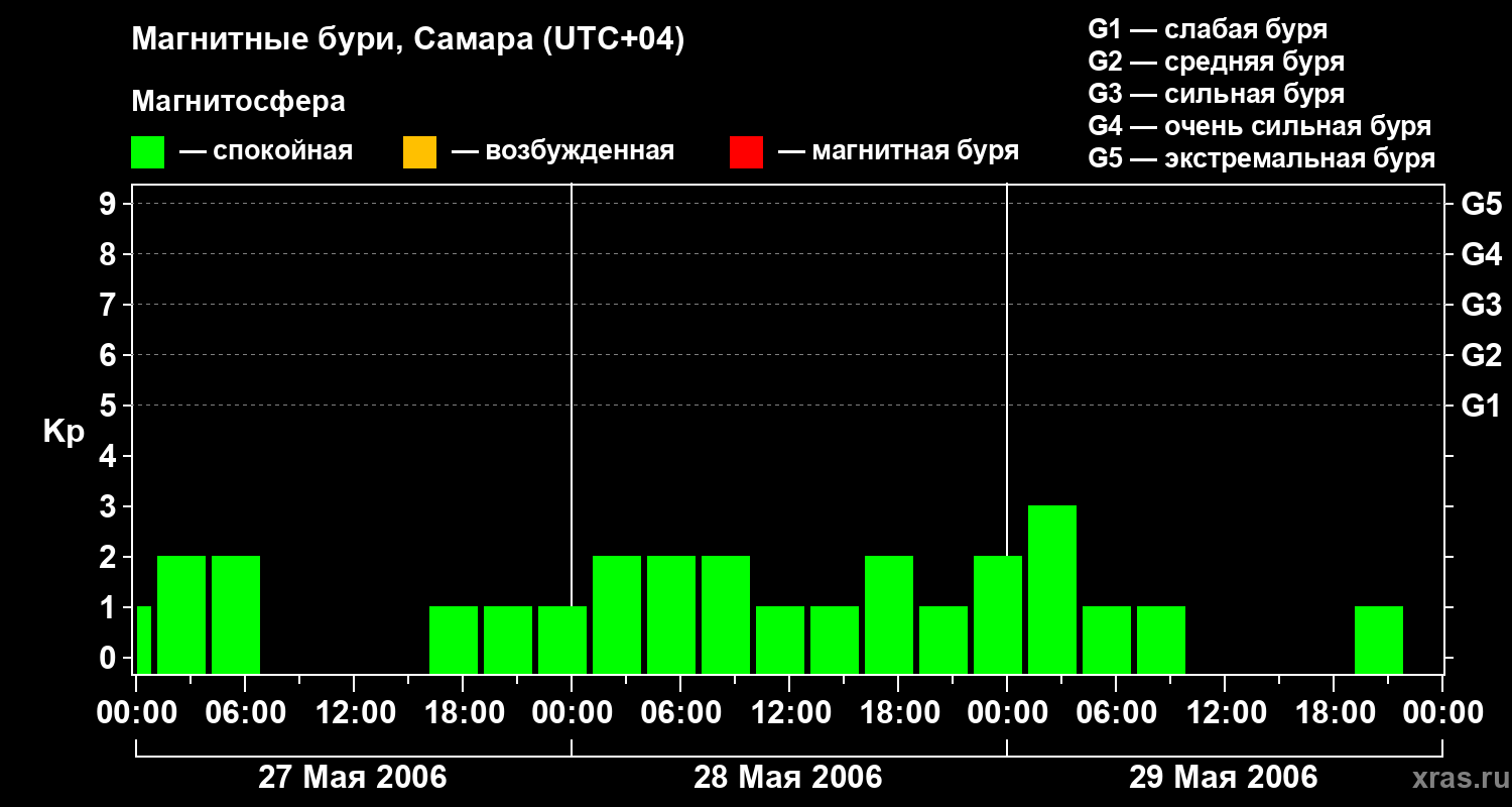 Изменения геомагнитного индекса Kp с 27 по 29 мая 2006 года для средних широт
