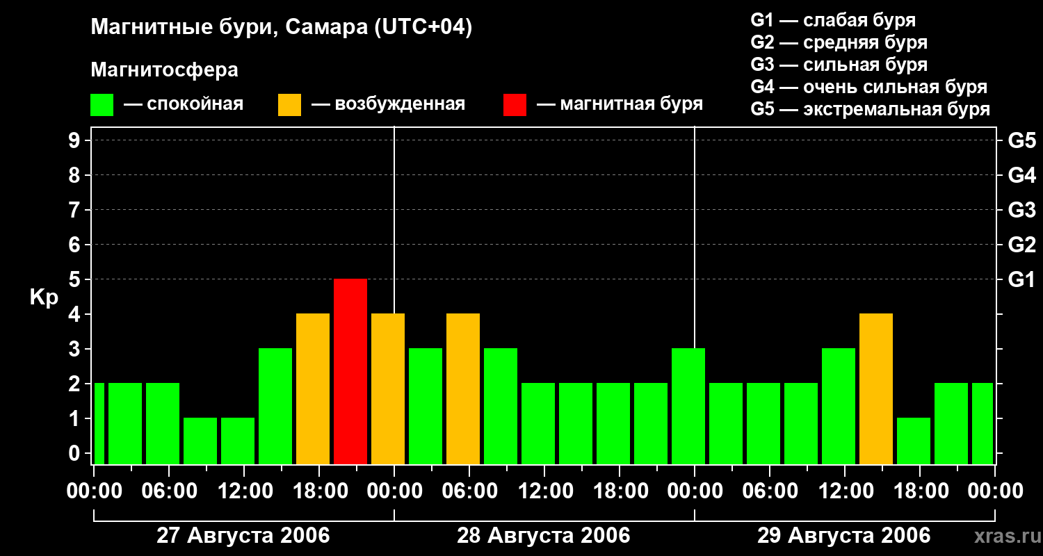 Изменения геомагнитного индекса Kp с 27 по 29 августа 2006 года для средних широт