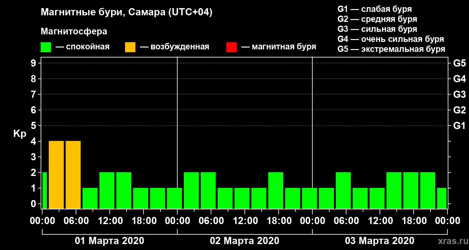Изменения геомагнитного индекса Kp с 1 по 3 марта 2020 года для средних широт