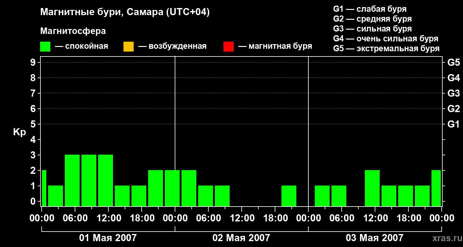 Изменения геомагнитного индекса Kp с 1 по 3 мая 2007 года для средних широт