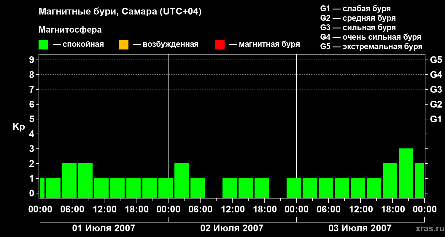 Изменения геомагнитного индекса Kp с 1 по 3 июля 2007 года для средних широт