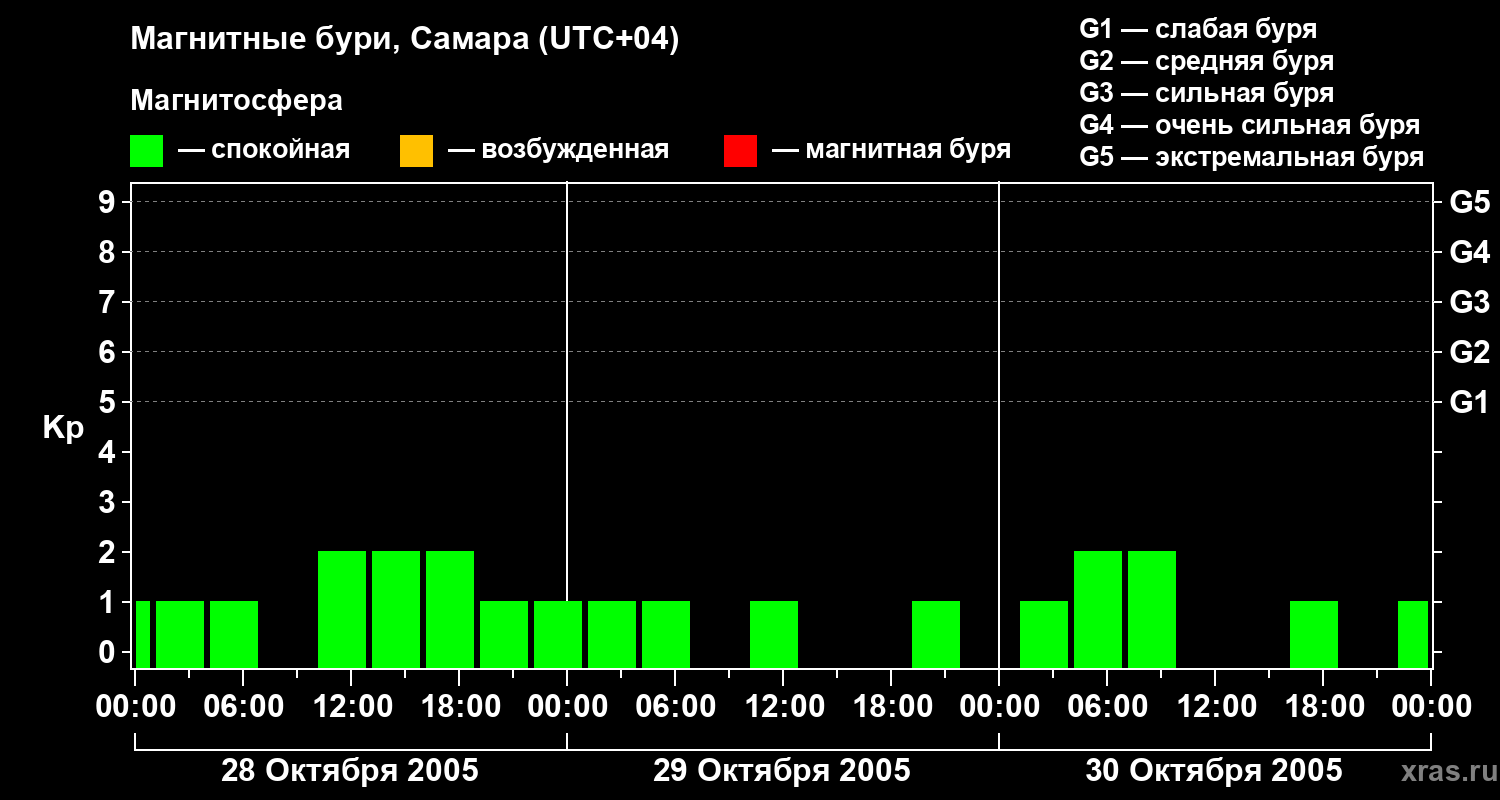 Изменения геомагнитного индекса Kp с 28 по 30 октября 2005 года для средних широт