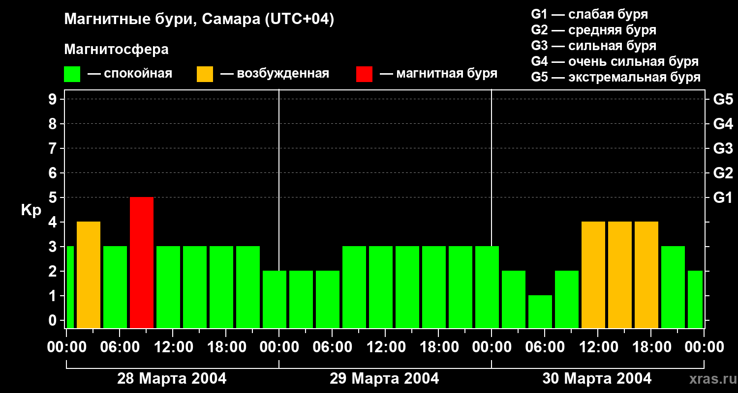 Изменения геомагнитного индекса Kp с 28 по 30 марта 2004 года для средних широт