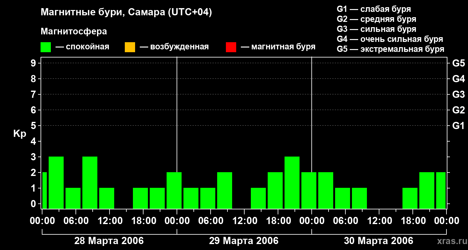 Изменения геомагнитного индекса Kp с 28 по 30 марта 2006 года для средних широт