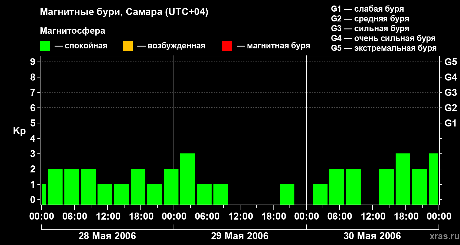Изменения геомагнитного индекса Kp с 28 по 30 мая 2006 года для средних широт