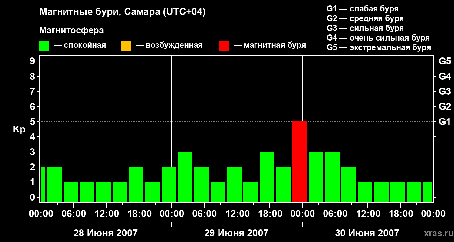 Изменения геомагнитного индекса Kp с 28 по 30 июня 2007 года для средних широт