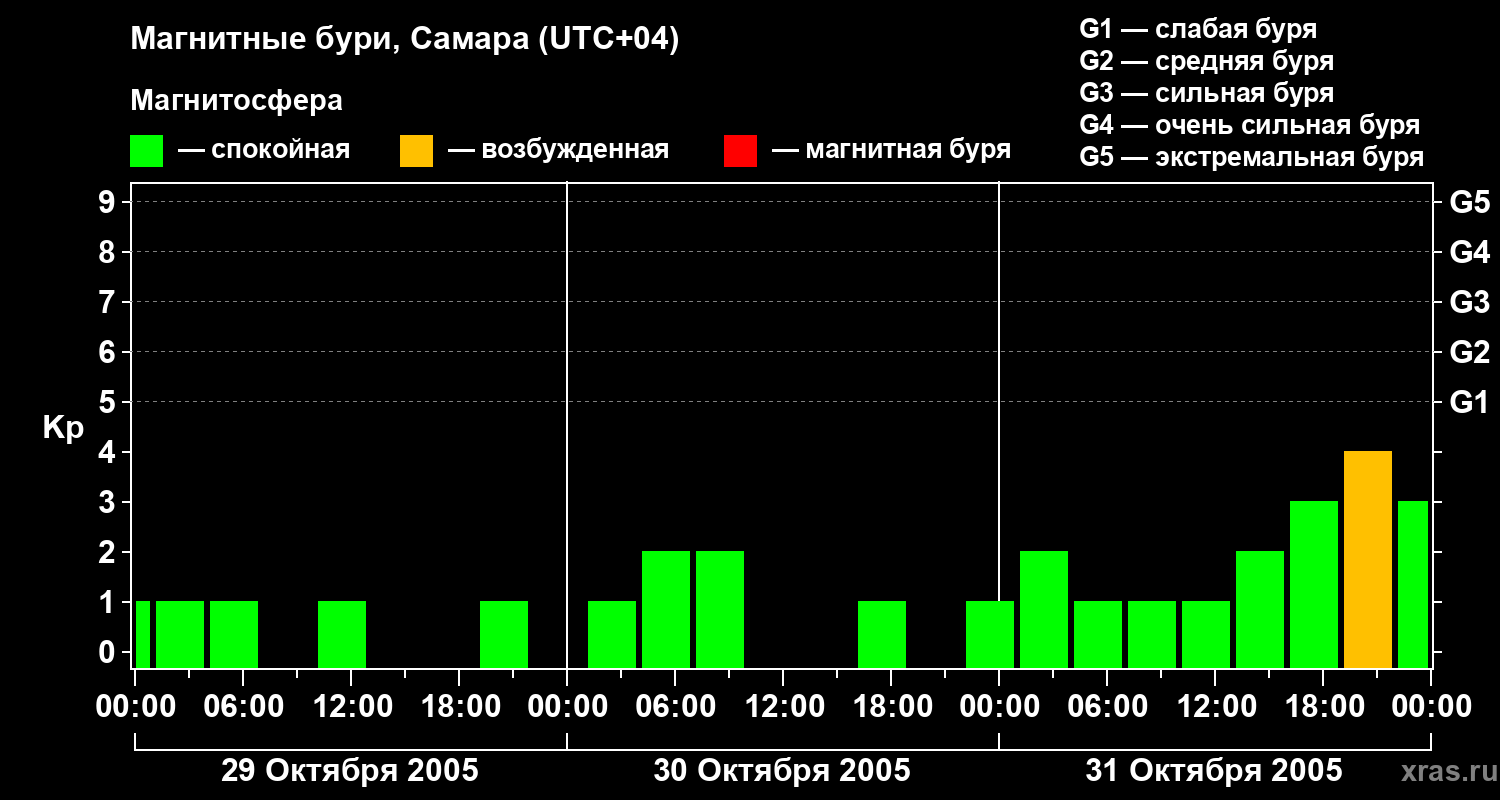 Изменения геомагнитного индекса Kp с 29 по 31 октября 2005 года для средних широт