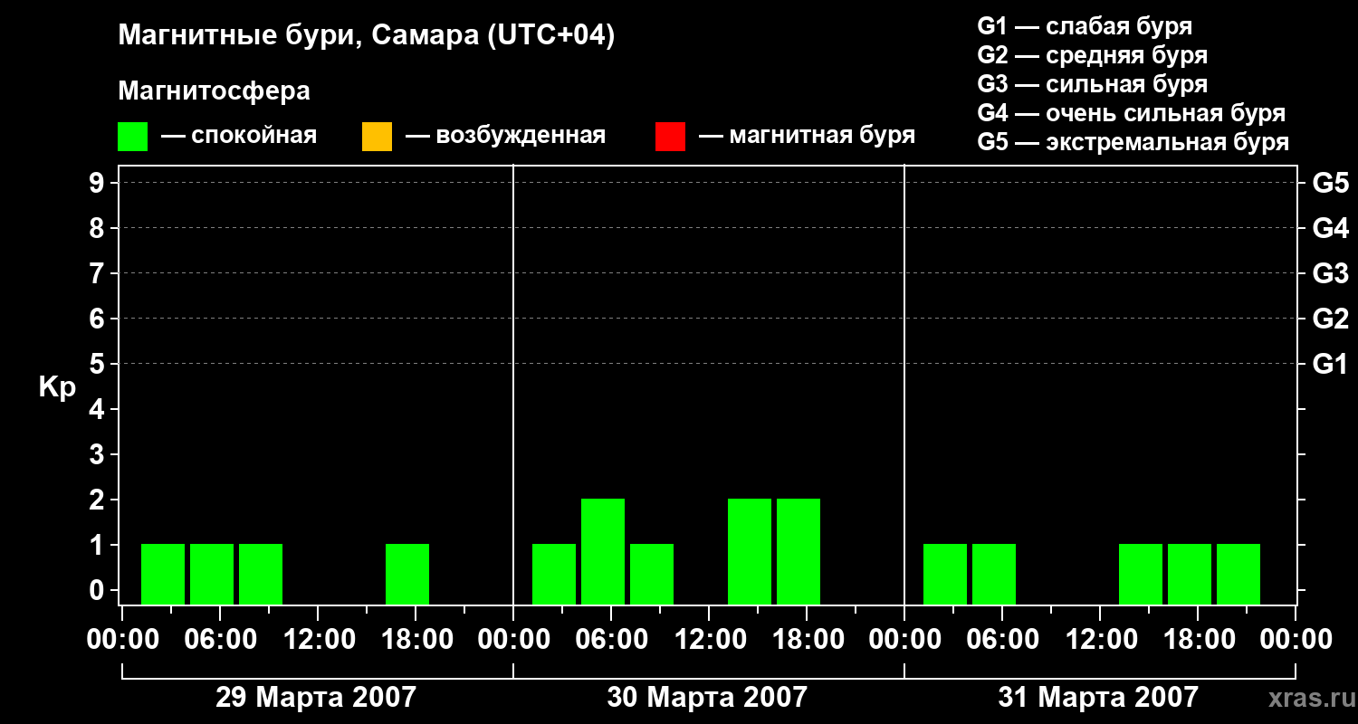 Изменения геомагнитного индекса Kp с 29 по 31 марта 2007 года для средних широт