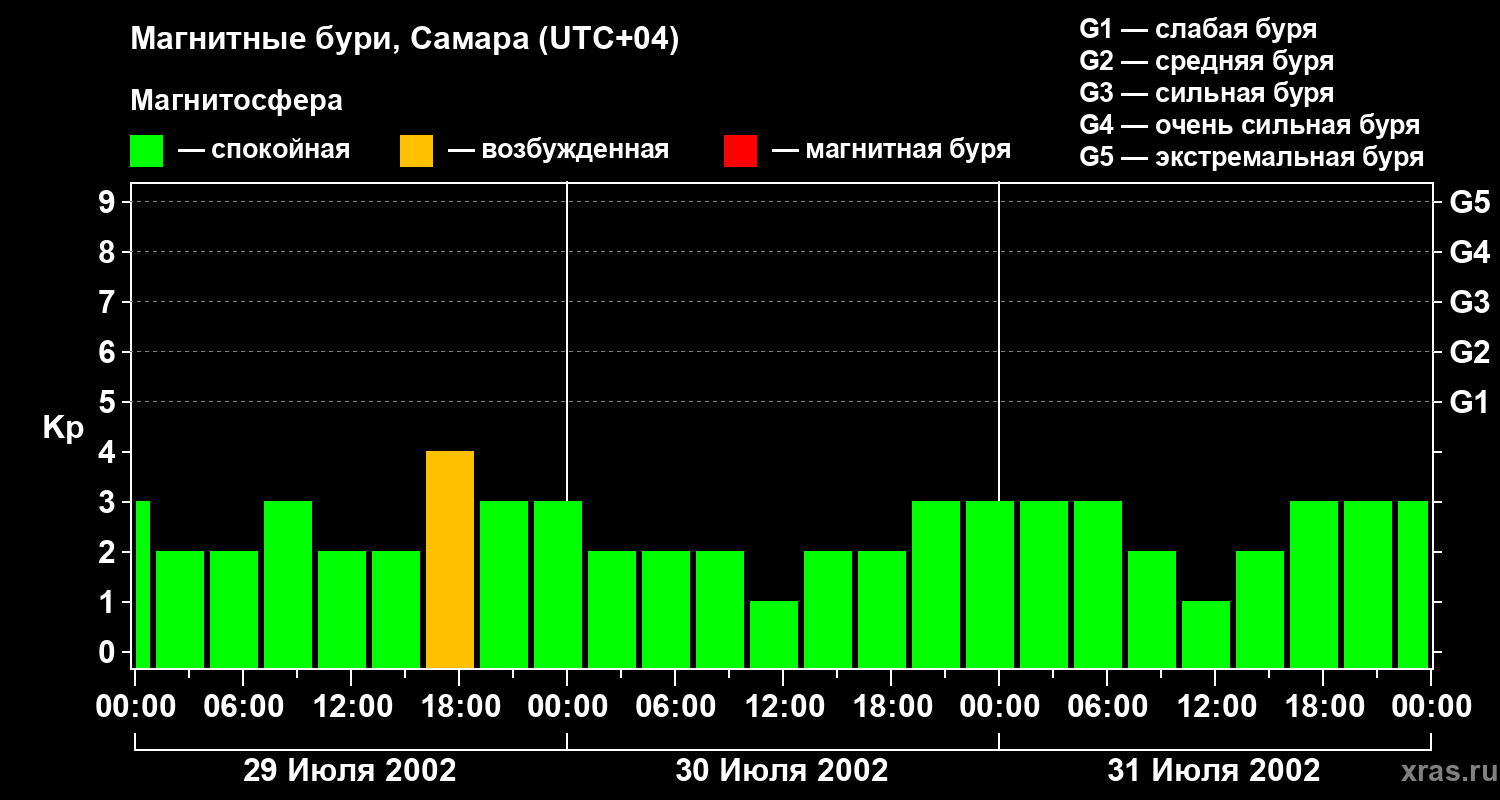 Изменения геомагнитного индекса Kp с 29 по 31 июля 2002 года для средних широт