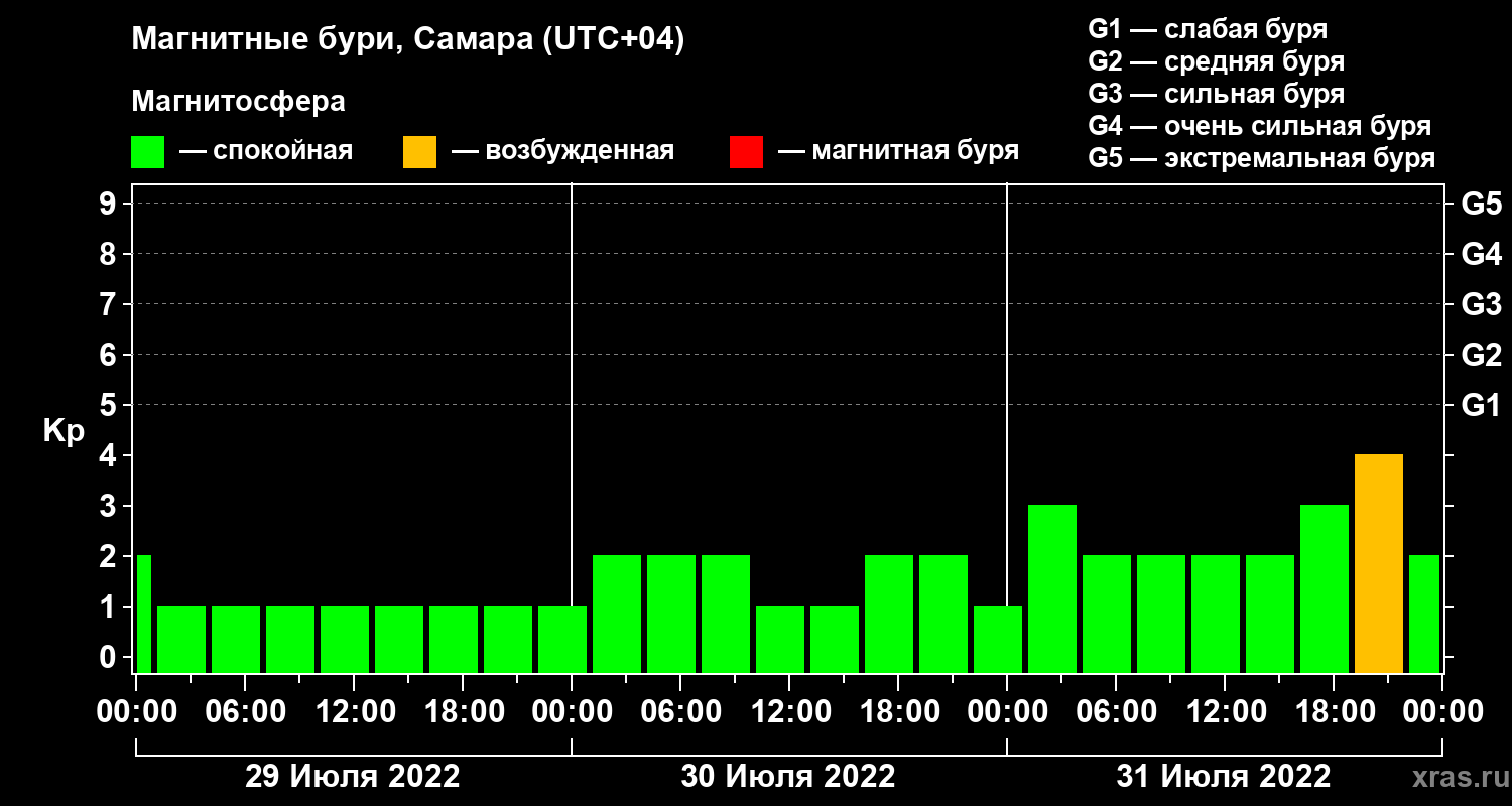 Изменения геомагнитного индекса Kp с 29 по 31 июля 2022 года для средних широт