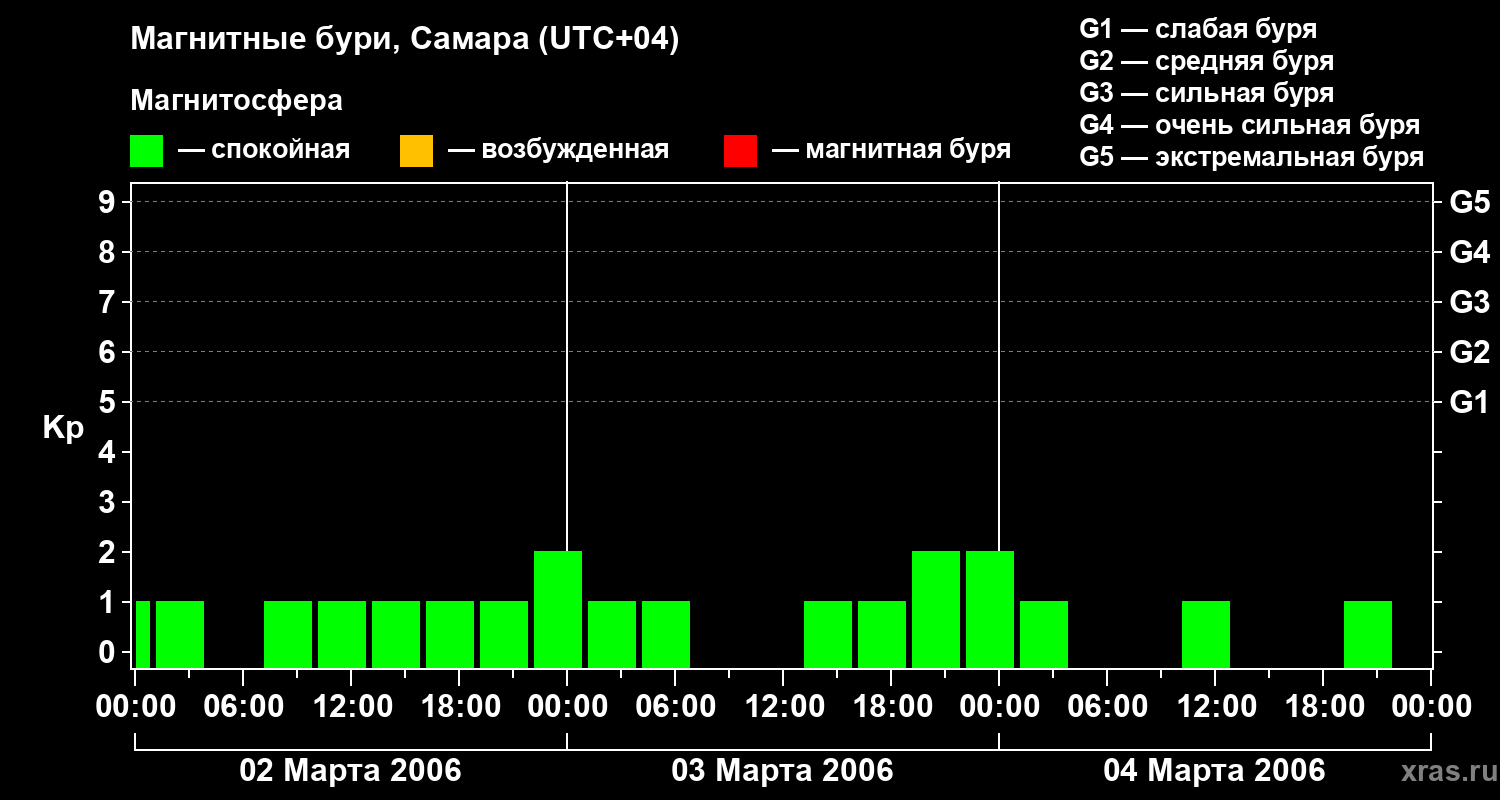 Изменения геомагнитного индекса Kp с 2 по 4 марта 2006 года для средних широт