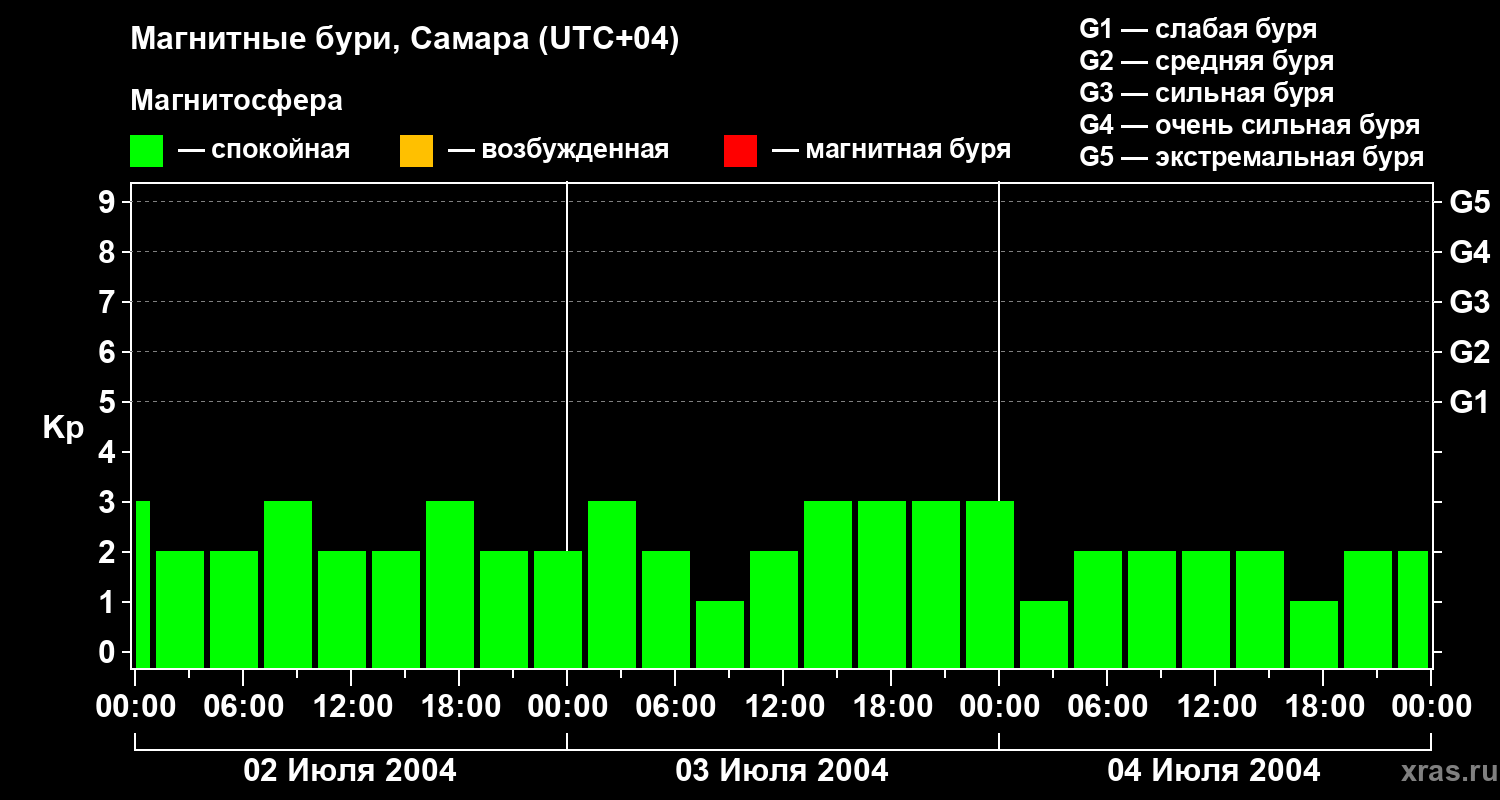 Изменения геомагнитного индекса Kp с 2 по 4 июля 2004 года для средних широт