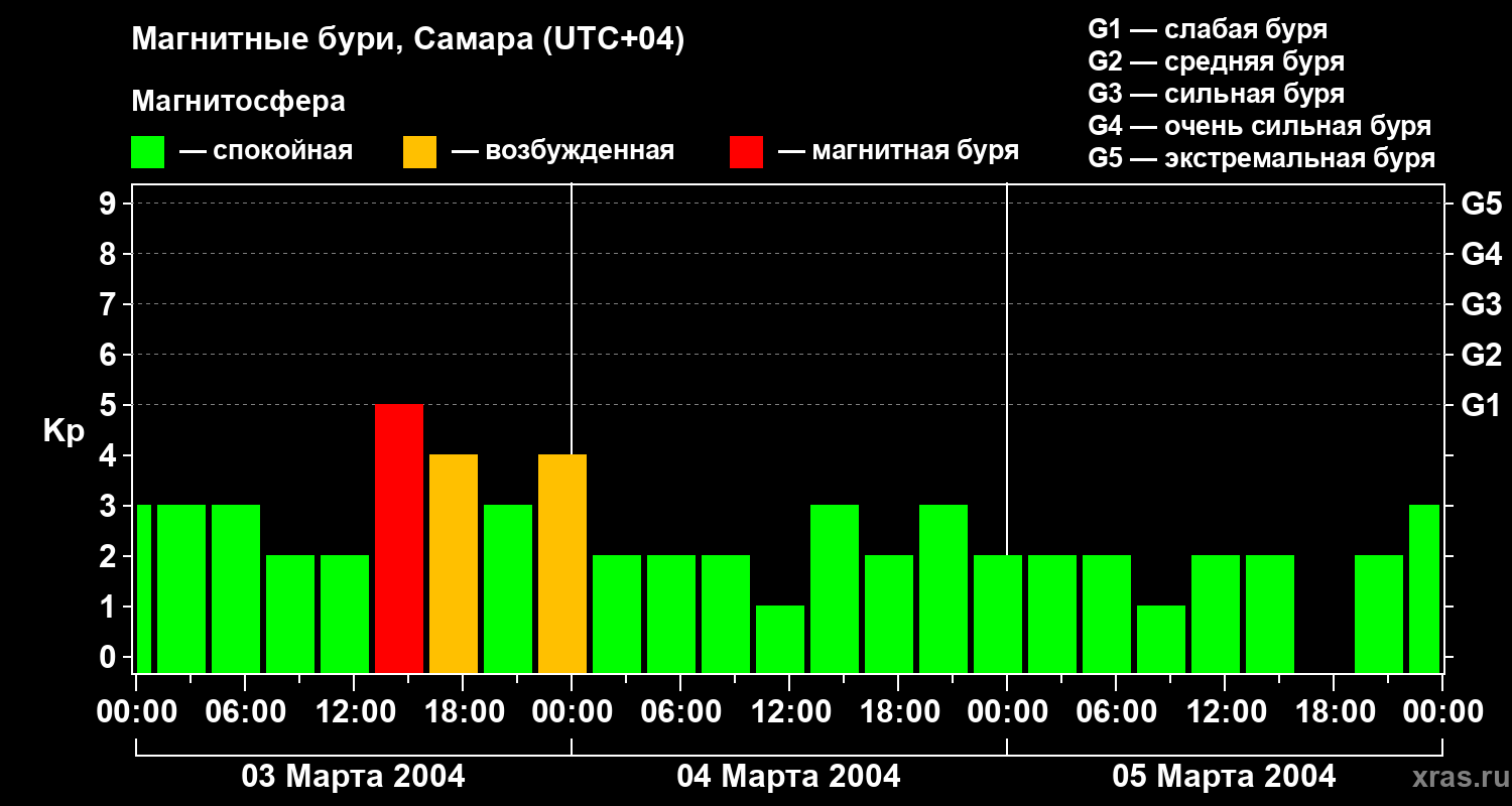 Изменения геомагнитного индекса Kp с 3 по 5 марта 2004 года для средних широт