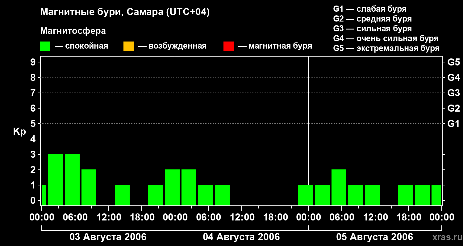 Изменения геомагнитного индекса Kp с 3 по 5 августа 2006 года для средних широт