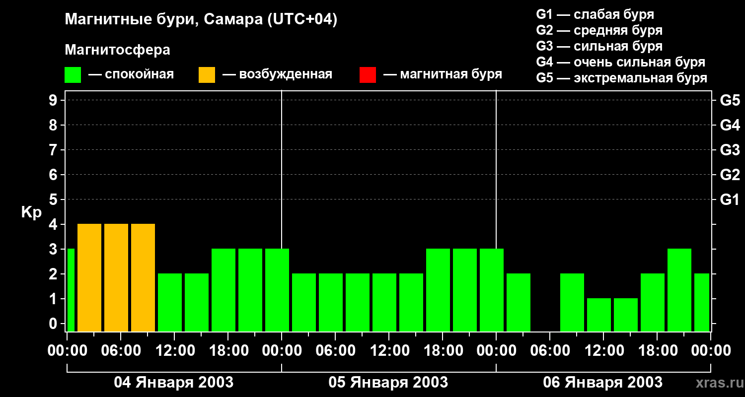 Изменения геомагнитного индекса Kp с 4 по 6 января 2003 года для средних широт