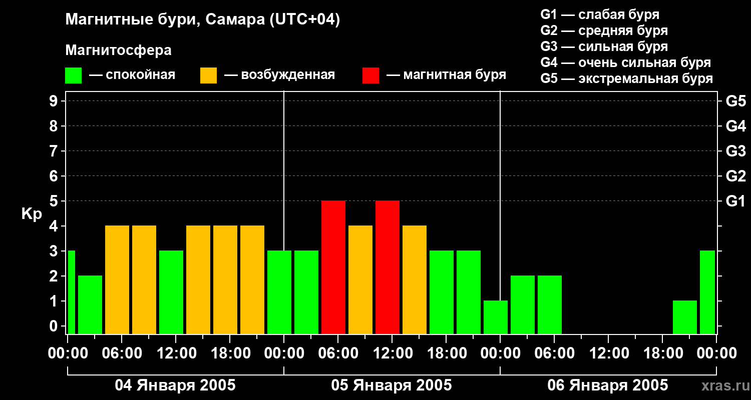 Изменения геомагнитного индекса Kp с 4 по 6 января 2005 года для средних широт