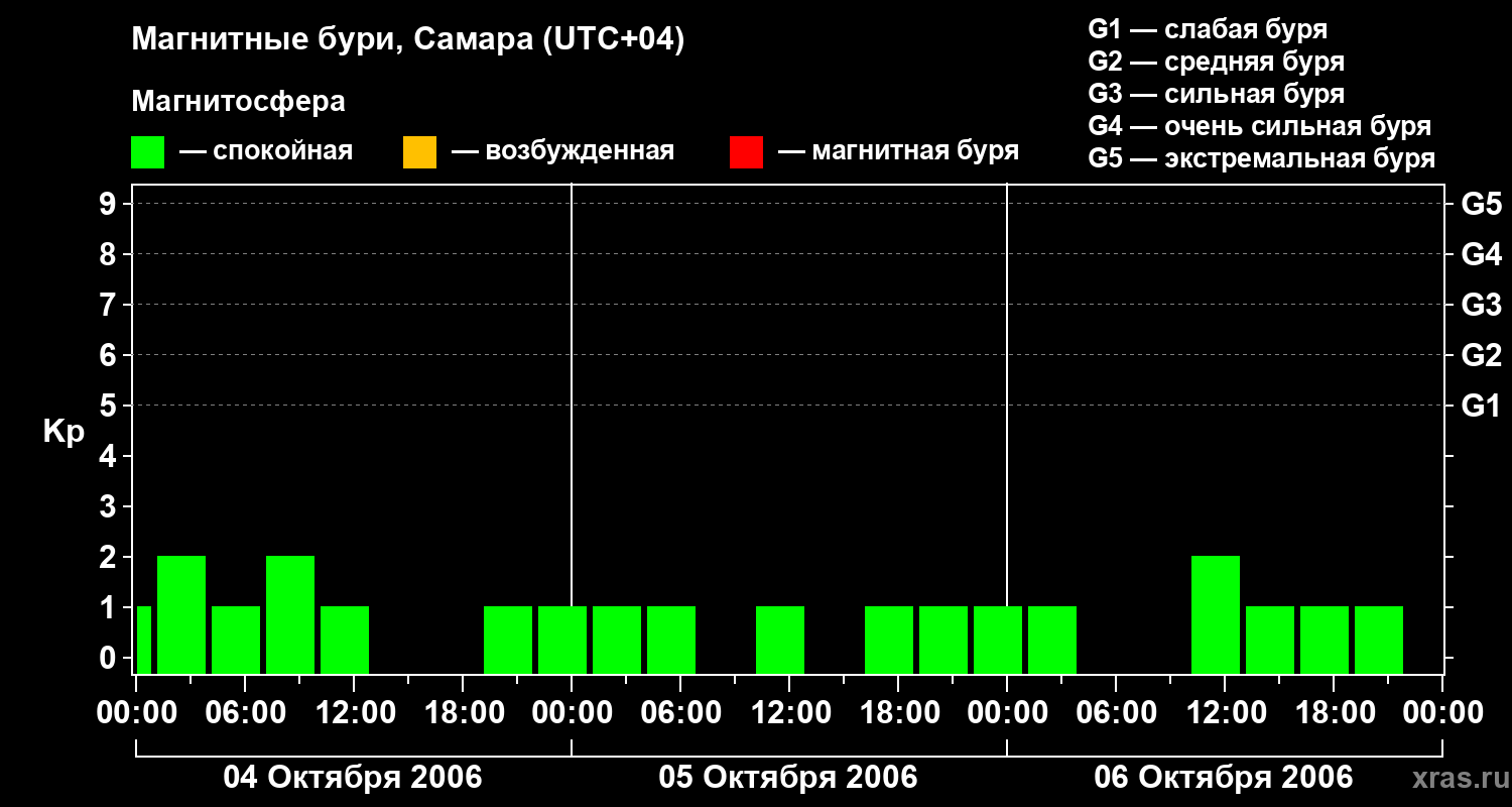Изменения геомагнитного индекса Kp с 4 по 6 октября 2006 года для средних широт