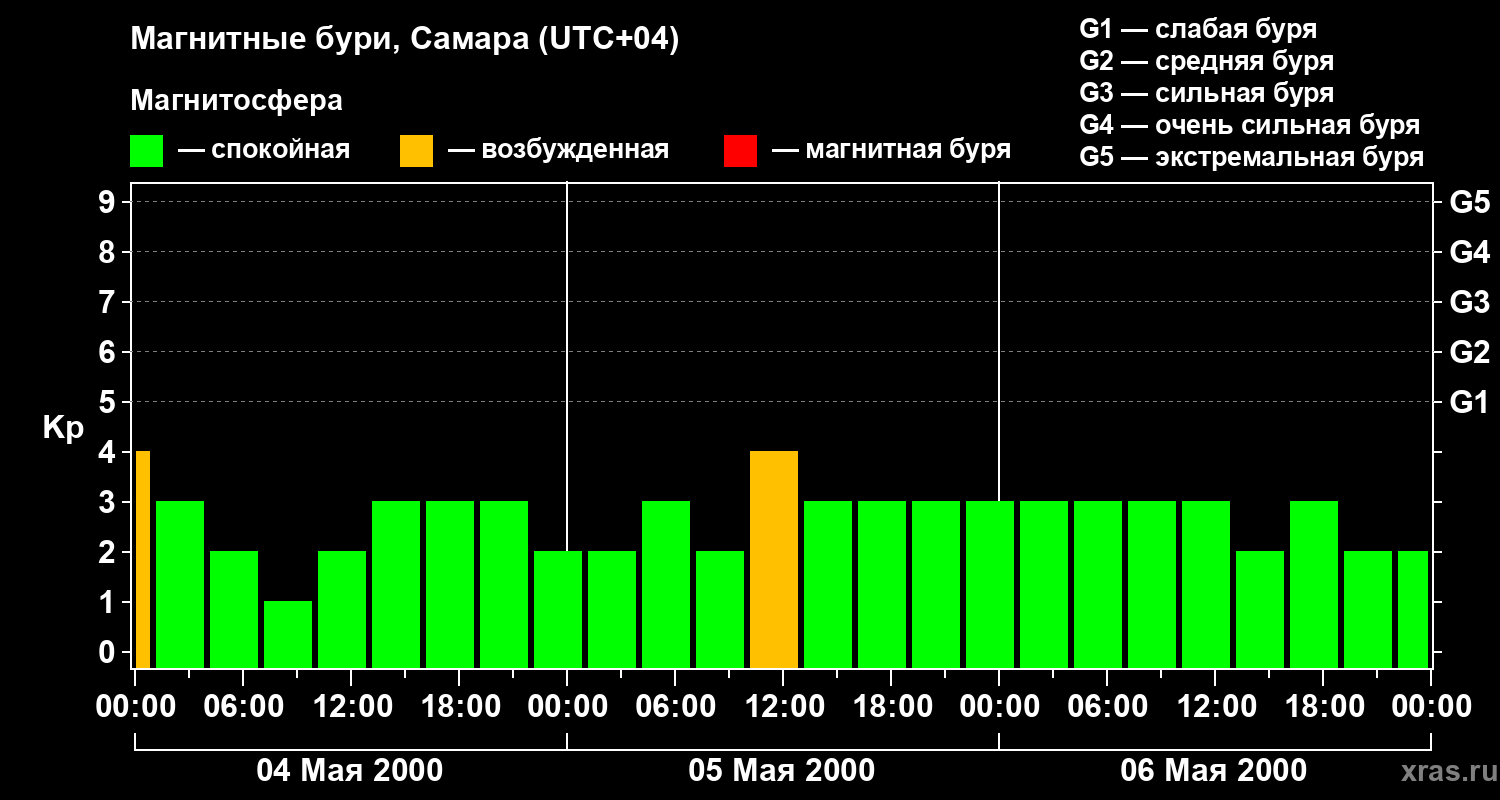 Изменения геомагнитного индекса Kp с 4 по 6 мая 2000 года для средних широт