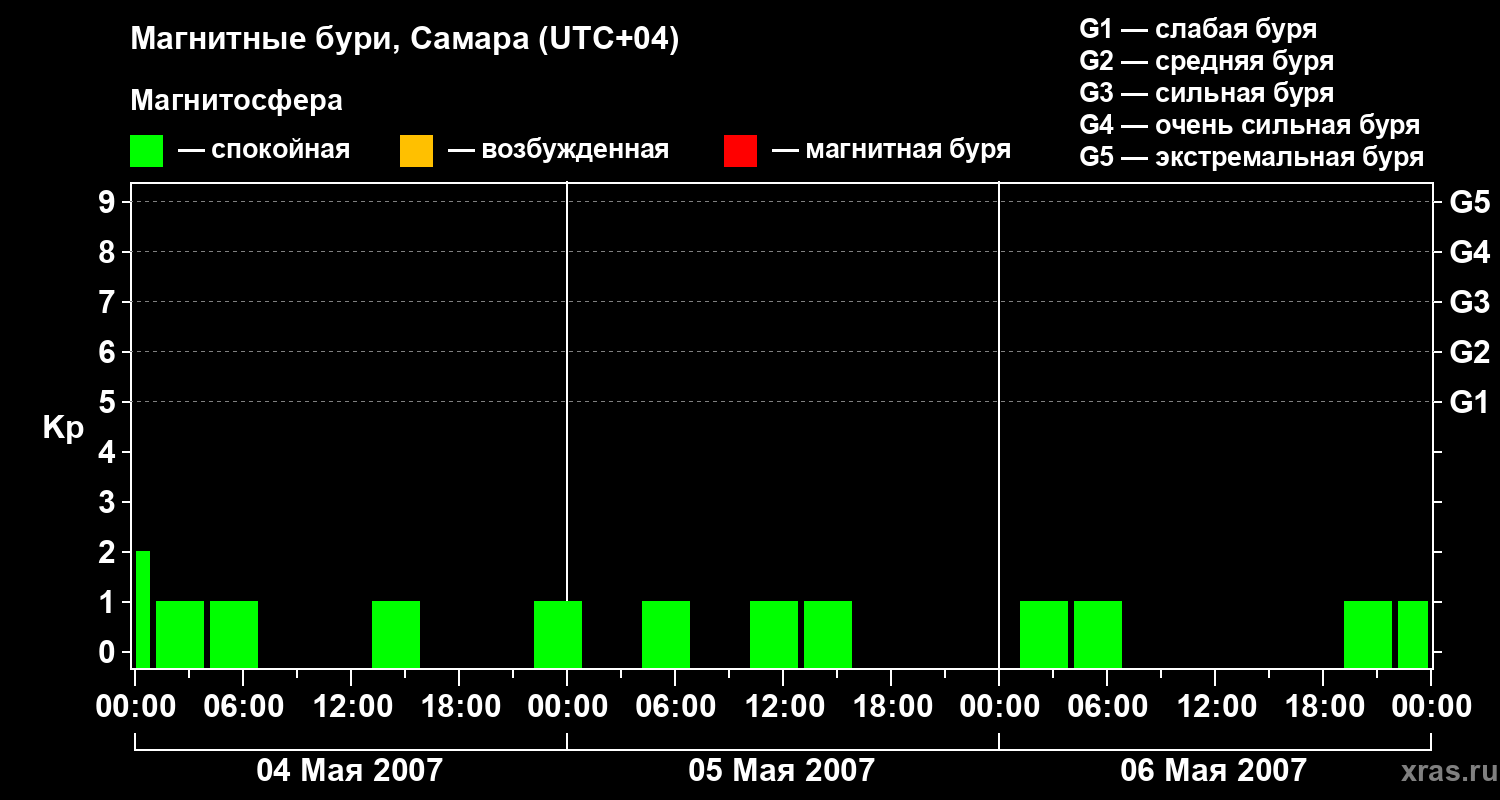 Изменения геомагнитного индекса Kp с 4 по 6 мая 2007 года для средних широт