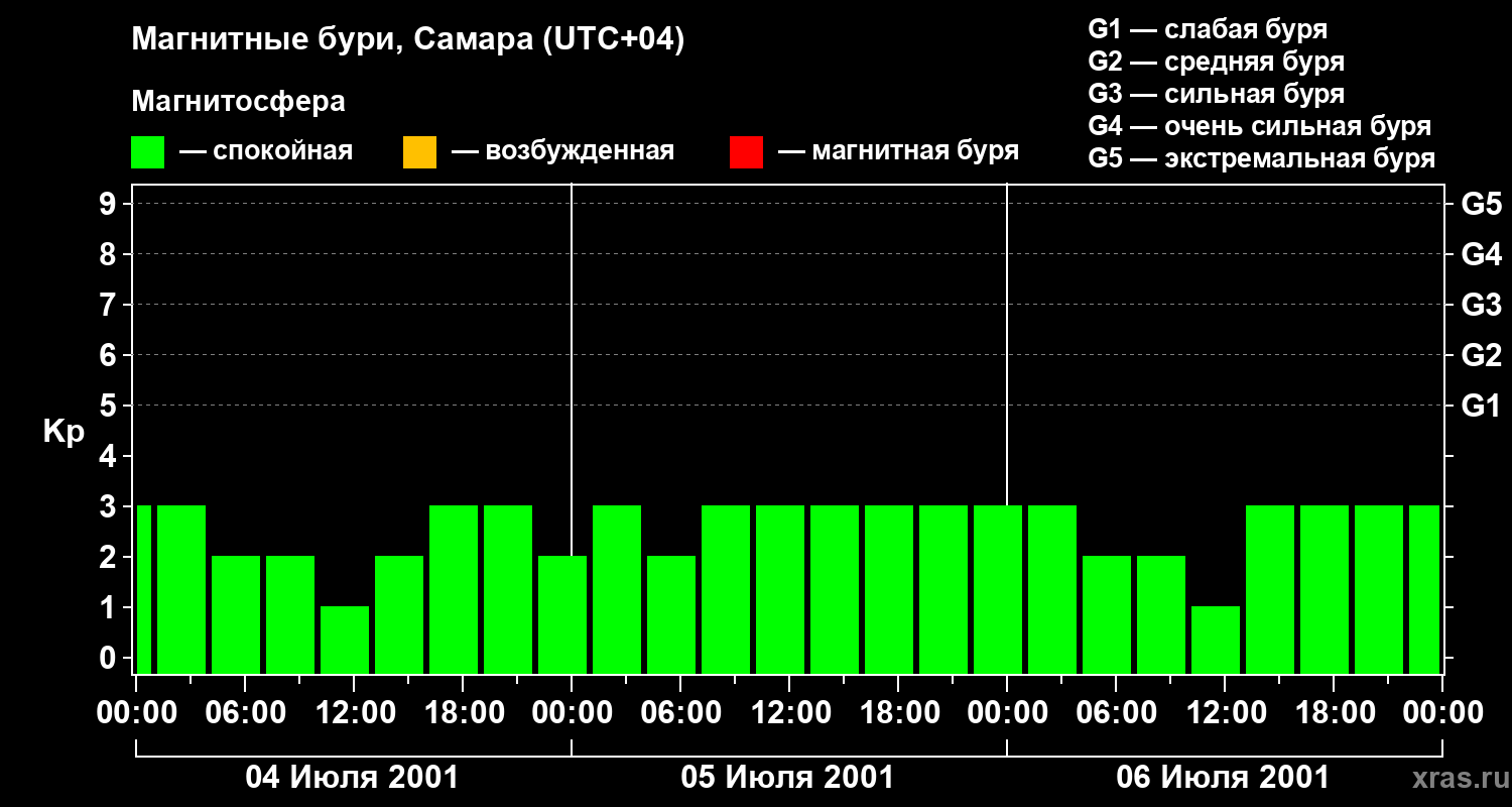 Изменения геомагнитного индекса Kp с 4 по 6 июля 2001 года для средних широт