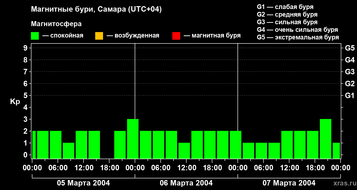 Изменения геомагнитного индекса Kp с 5 по 7 марта 2004 года для средних широт