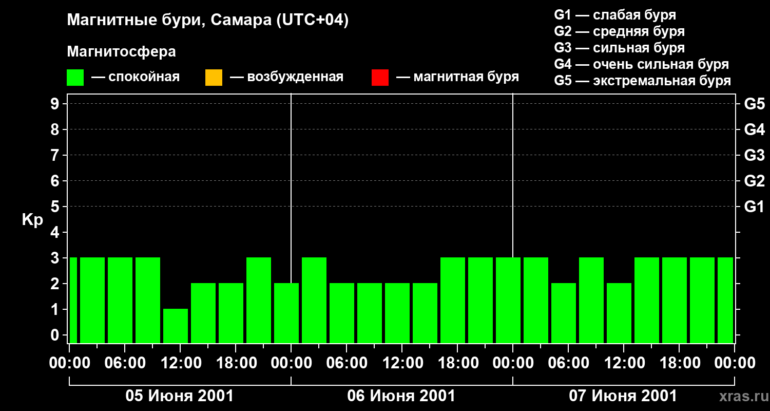Изменения геомагнитного индекса Kp с 5 по 7 июня 2001 года для средних широт