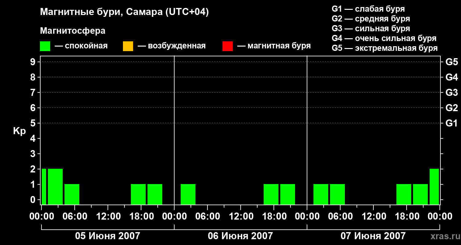 Изменения геомагнитного индекса Kp с 5 по 7 июня 2007 года для средних широт