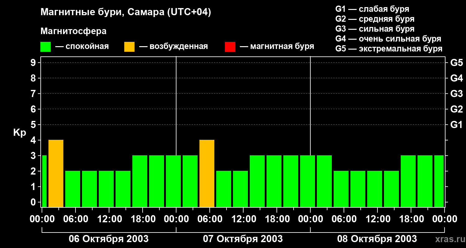 Изменения геомагнитного индекса Kp с 6 по 8 октября 2003 года для средних широт
