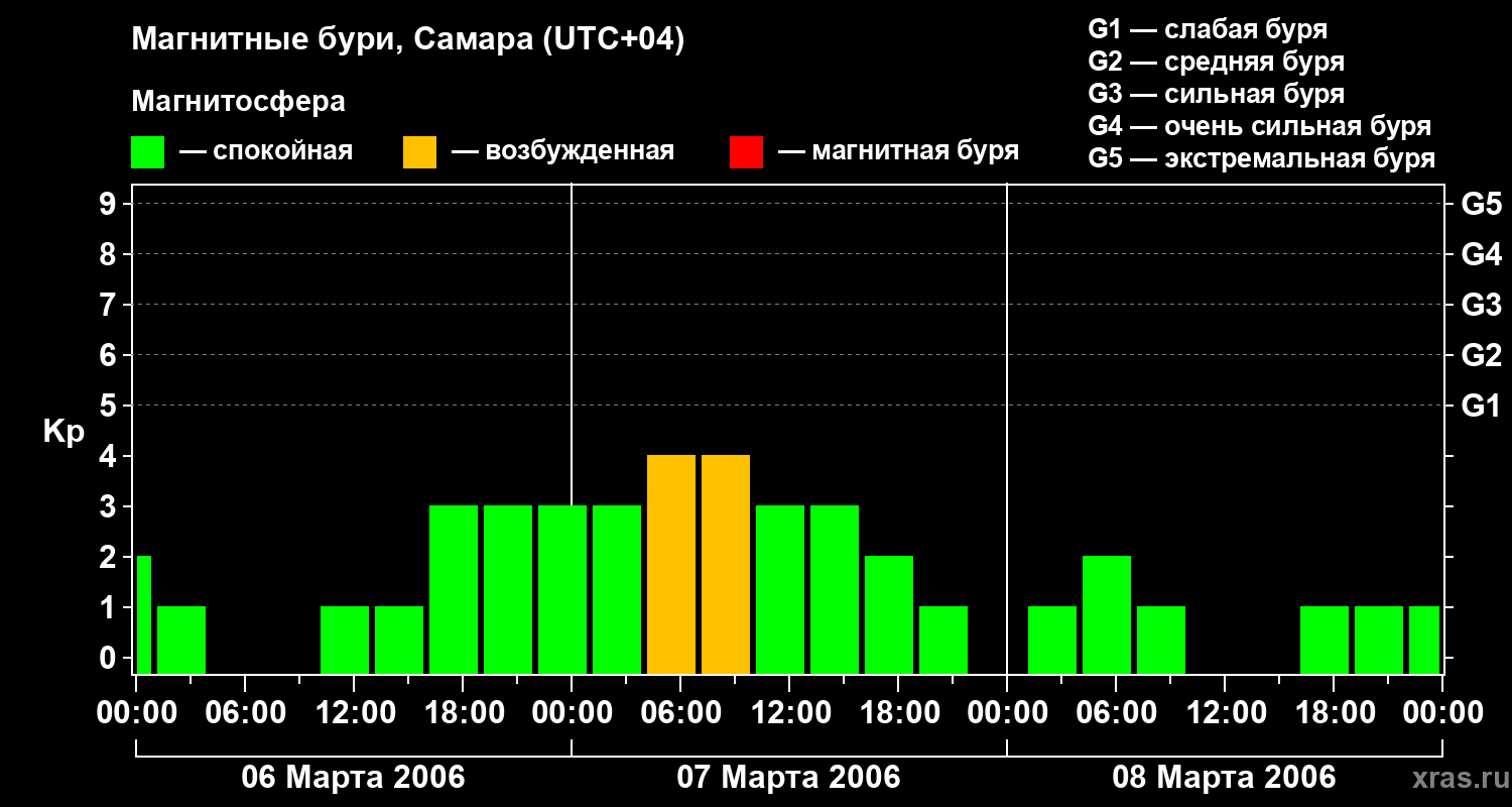 Изменения геомагнитного индекса Kp с 6 по 8 марта 2006 года для средних широт