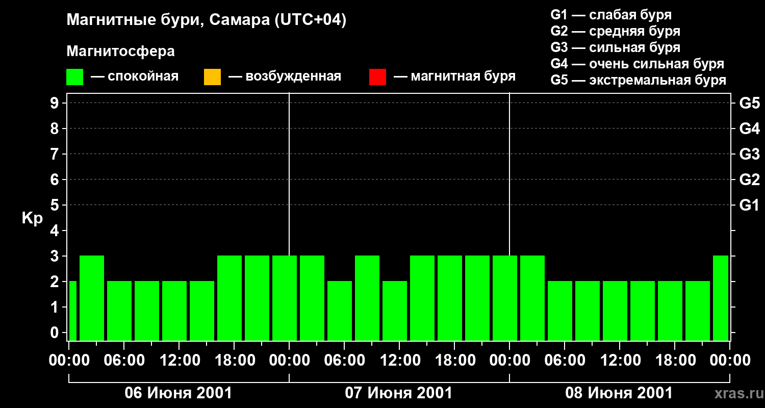 Изменения геомагнитного индекса Kp с 6 по 8 июня 2001 года для средних широт
