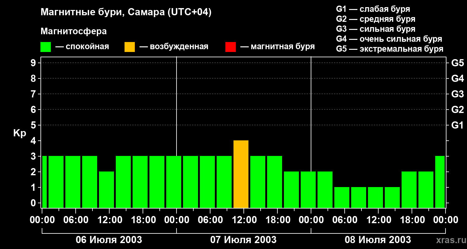 Изменения геомагнитного индекса Kp с 6 по 8 июля 2003 года для средних широт