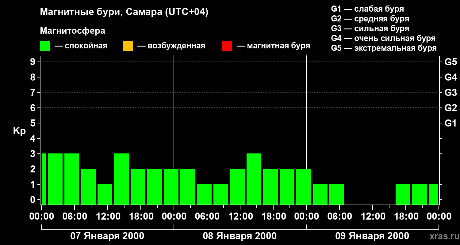 Изменения геомагнитного индекса Kp с 7 по 9 января 2000 года для средних широт
