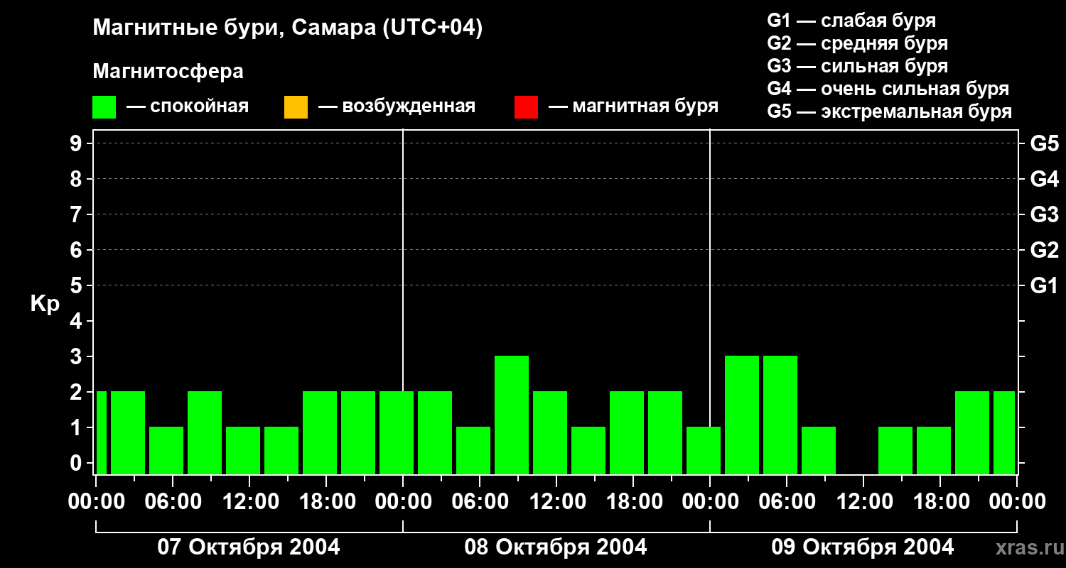 Изменения геомагнитного индекса Kp с 7 по 9 октября 2004 года для средних широт