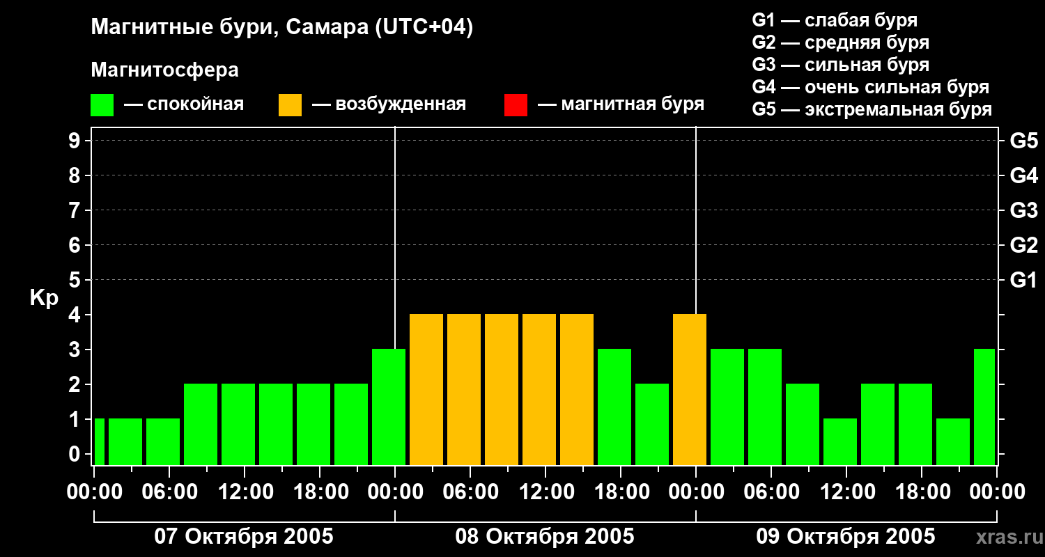 Изменения геомагнитного индекса Kp с 7 по 9 октября 2005 года для средних широт
