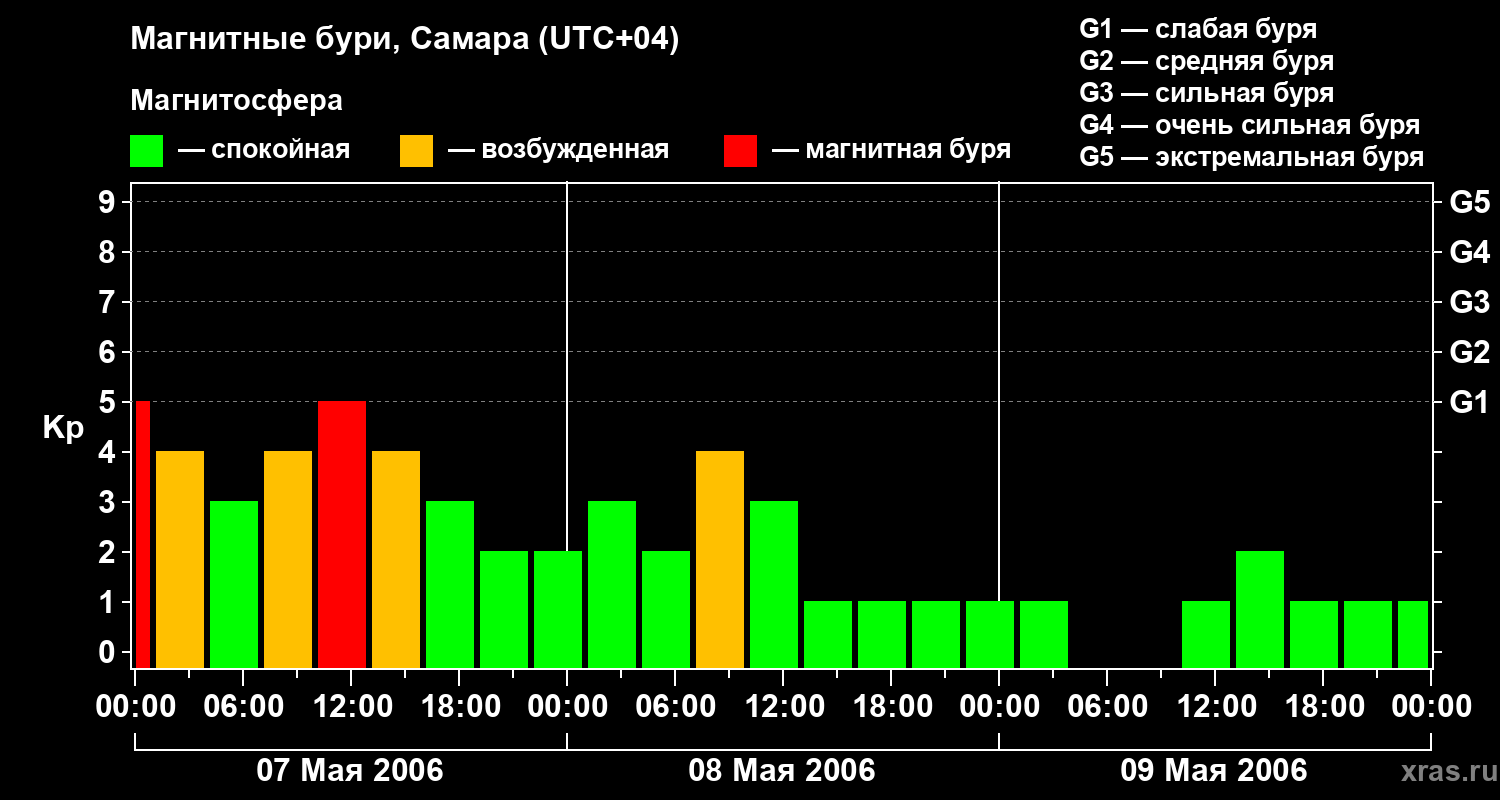 Изменения геомагнитного индекса Kp с 7 по 9 мая 2006 года для средних широт