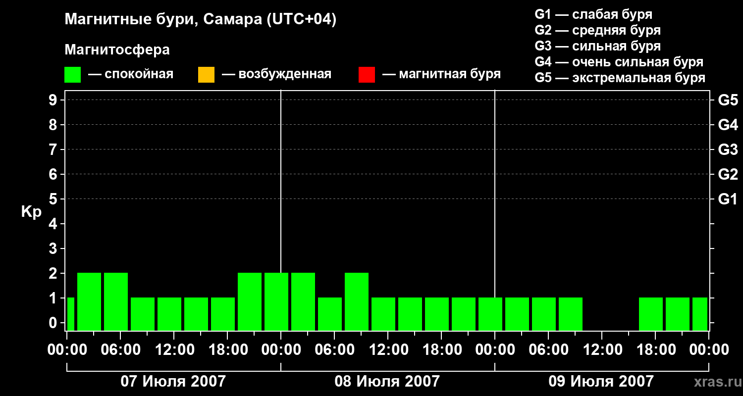 Изменения геомагнитного индекса Kp с 7 по 9 июля 2007 года для средних широт