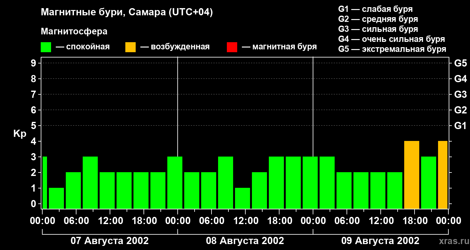 Изменения геомагнитного индекса Kp с 7 по 9 августа 2002 года для средних широт