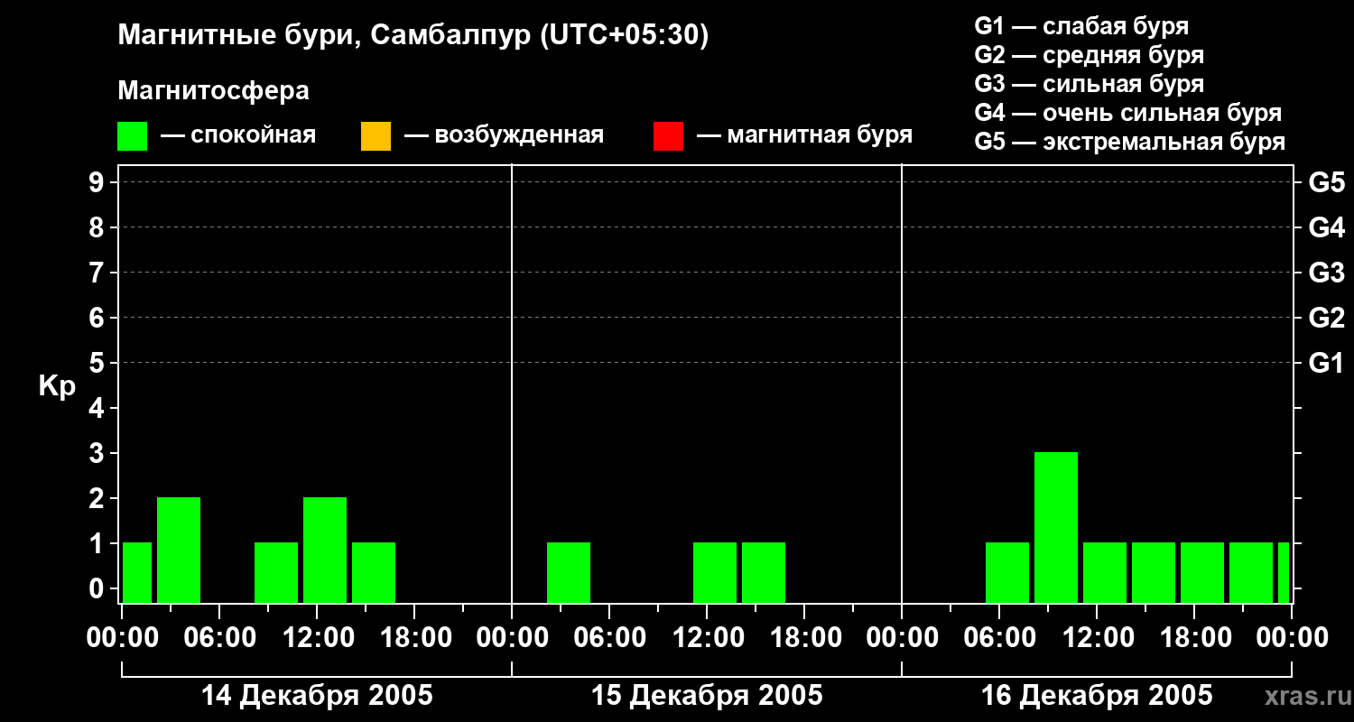 Изменения геомагнитного индекса Kp с 14 по 16 декабря 2005 года для средних широт