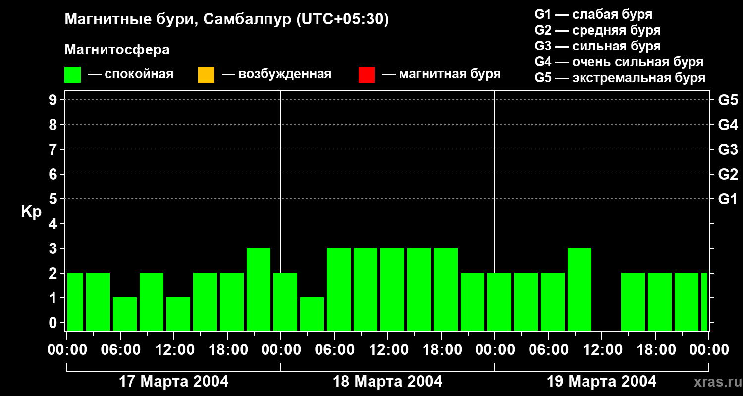 Изменения геомагнитного индекса Kp с 17 по 19 марта 2004 года для средних широт