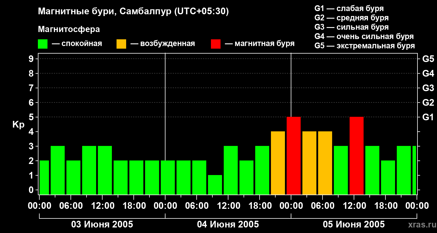 Изменения геомагнитного индекса Kp с 3 по 5 июня 2005 года для средних широт
