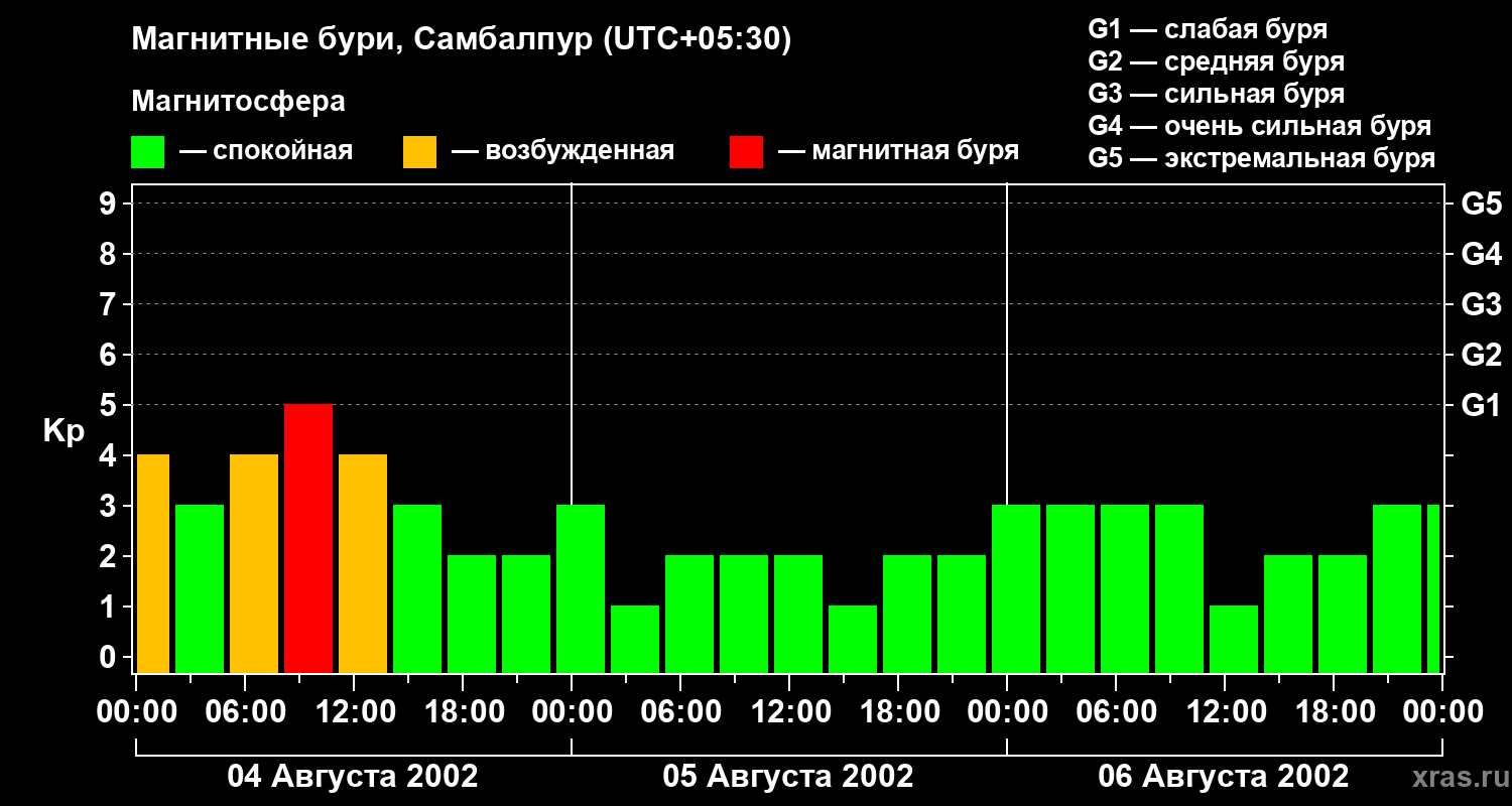 Изменения геомагнитного индекса Kp с 4 по 6 августа 2002 года для средних широт